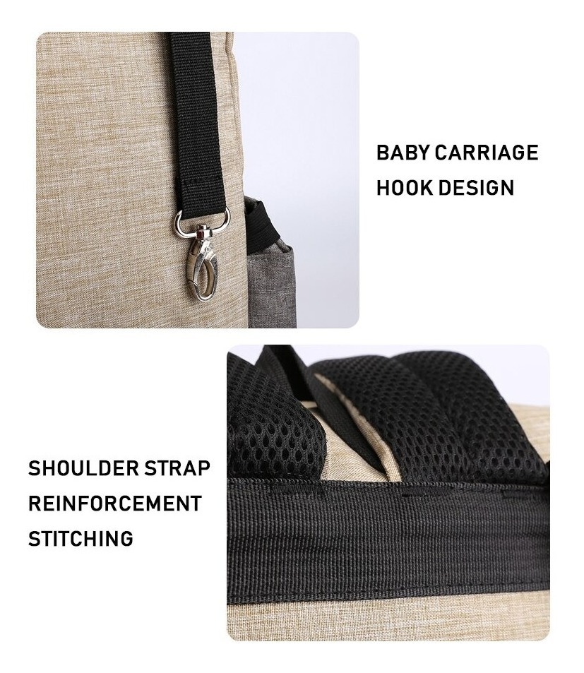 Material de alta calidad Uso de tejido de poliéster resistente a arañazos, resistente a la abrasión, resistente a las lágrimas. Fuerte y duradero, muy adecuado para el uso de las madres. Impermeable La capa exterior de la bolsa está hecha de tela impermeable de alta calidad, que es resistente al agua, dust-proof.So incluso si se utiliza en días lluviosos, no hay necesidad de preocuparse en absoluto. De gran capacidad La bolsa tiene una gran capacidad y puede almacenar muchas cosas, como biberones, pañales y ropa, que se pueden poner fácilmente sin preocuparse por no tener suficiente espacio. Multifuncional Diseñado para múltiples propósitos, puede usarlo como mochila, bolso, bolso de hombro o colgar en el cochecito. Ámbito de aplicación Pequeño y portátil, práctico y práctico. Perfecto para viajar, escapadas de fin de semana, compras y otras actividades al aire libre en la vida diaria.