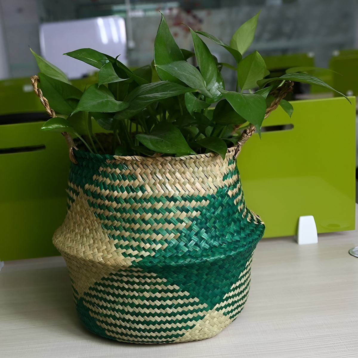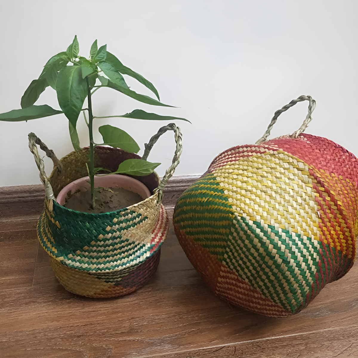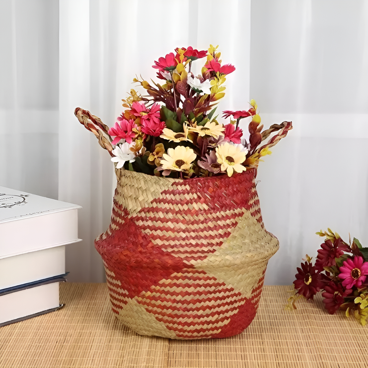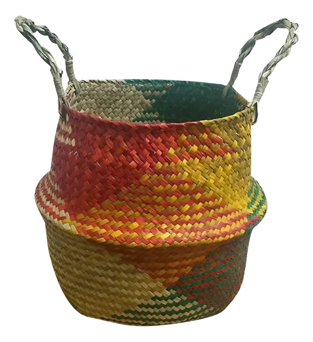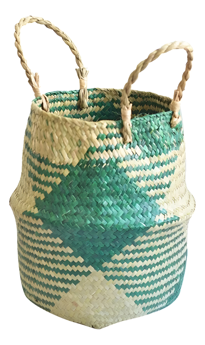 Aportá un toque natural y artesanal a tu hogar con este cesto tejido en fibra natural. Su diseño con detalles en tonos cálidos lo convierte en una pieza decorativa única, perfecta para distintos ambientes.