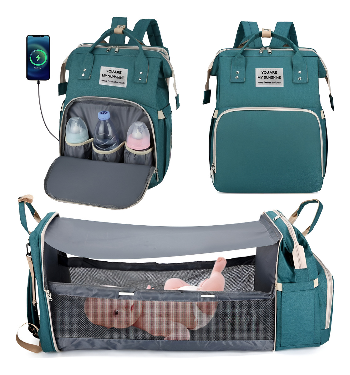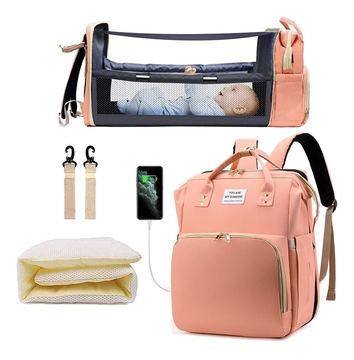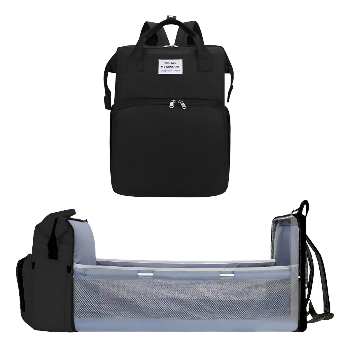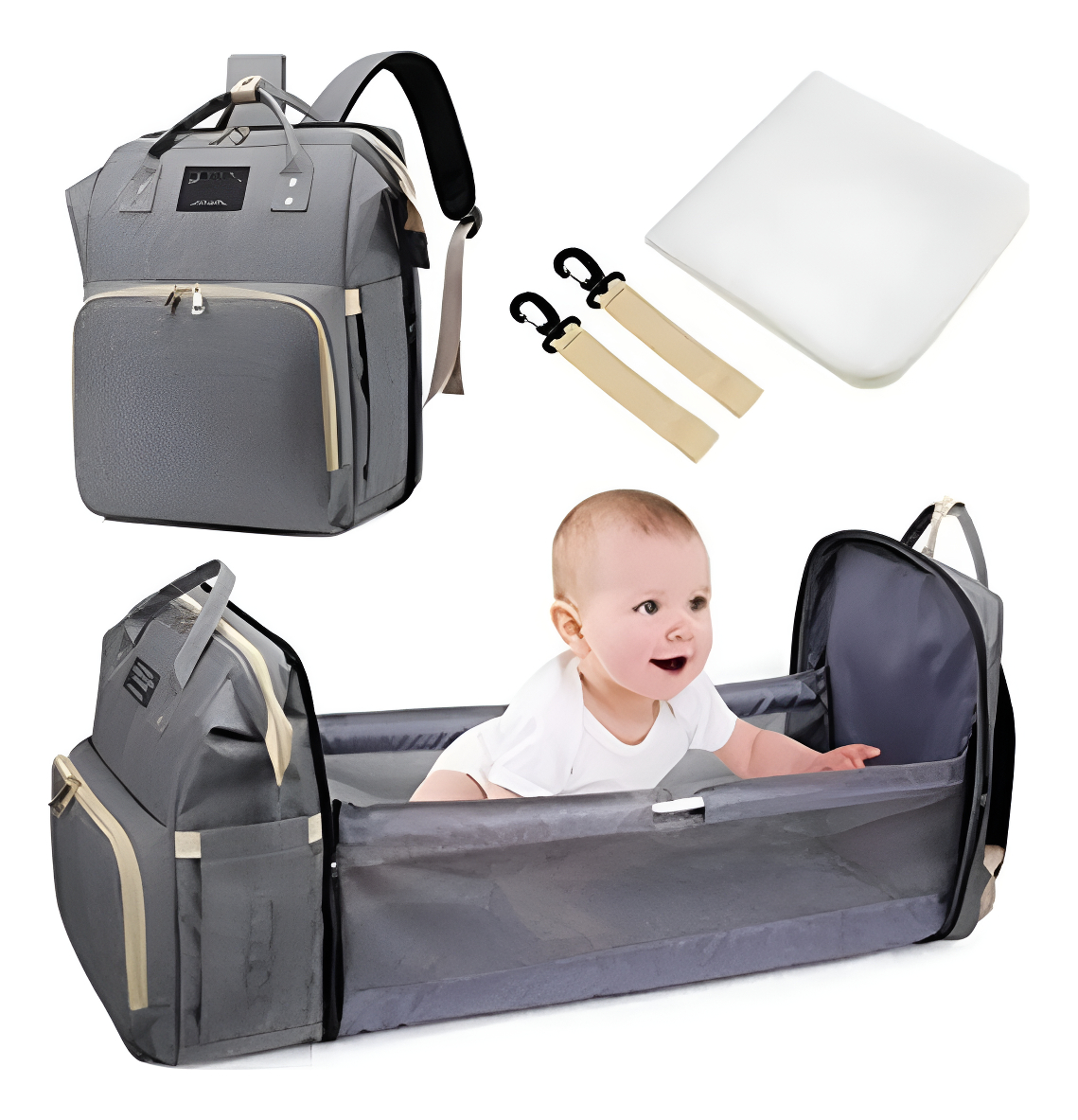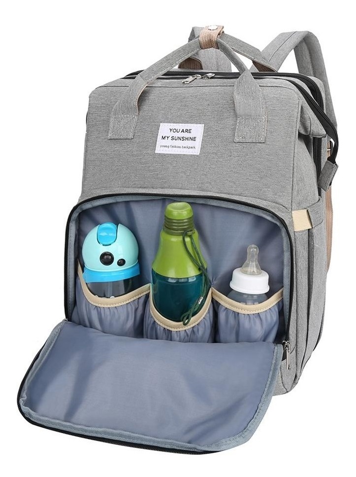 A simple vista puede parecer un bolso maternal, pero en instantes puede convertirse en una cuna para bebé o un cambiador portátil de 30,5cm x 70cm de largo proporcionando un espacio seguro e higiénico para cambiar tu bebé; o que descanse al aire libre, ya que cuenta con colchón, mosquitera y tela parasol.