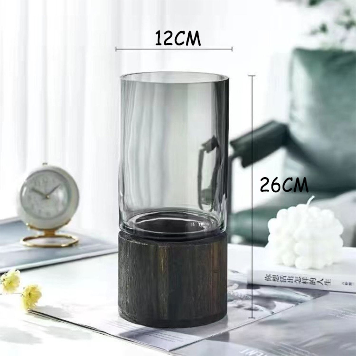 Florero moderno en vidrio con base en madera – Chico |