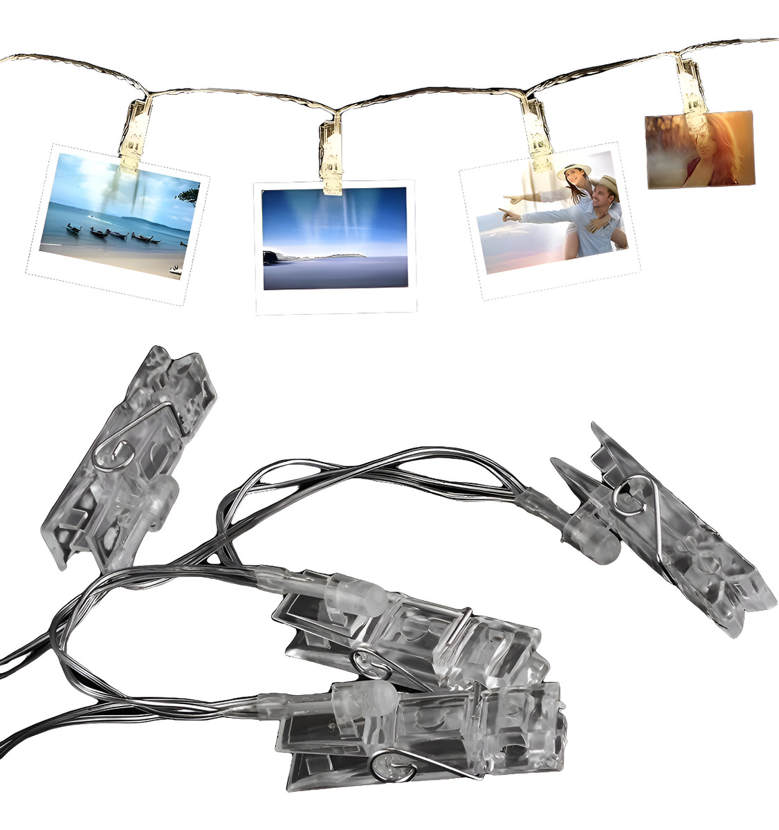 . 10 clips luminosos distribuidos a 15 cm de distancia, ideal para mostrar tus momentos favoritos.