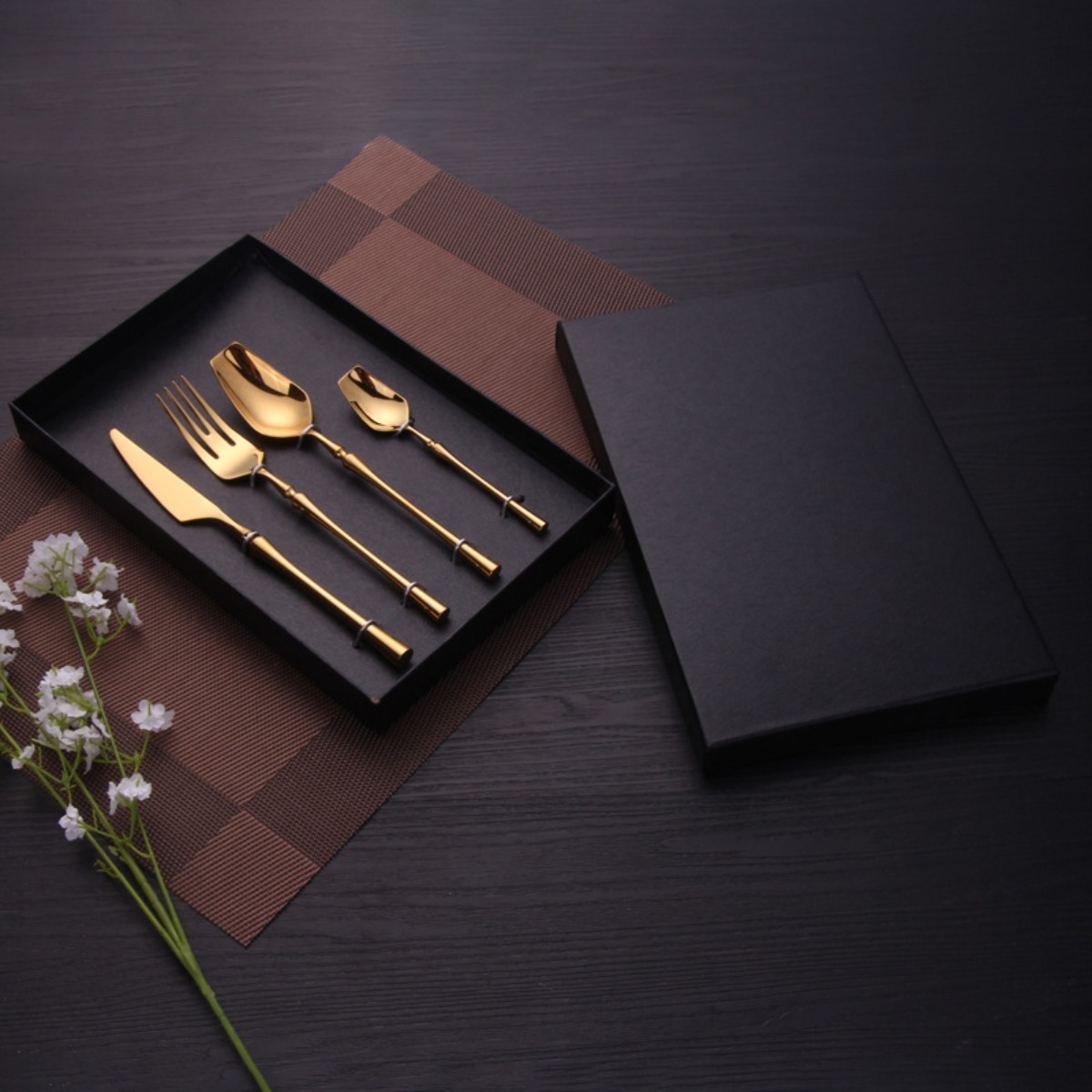 Caja x 4 cubiertos en acero inoxidable color dorado, ideal para un regalo empresarial, o para uso durante una cena o almuerzo especial.