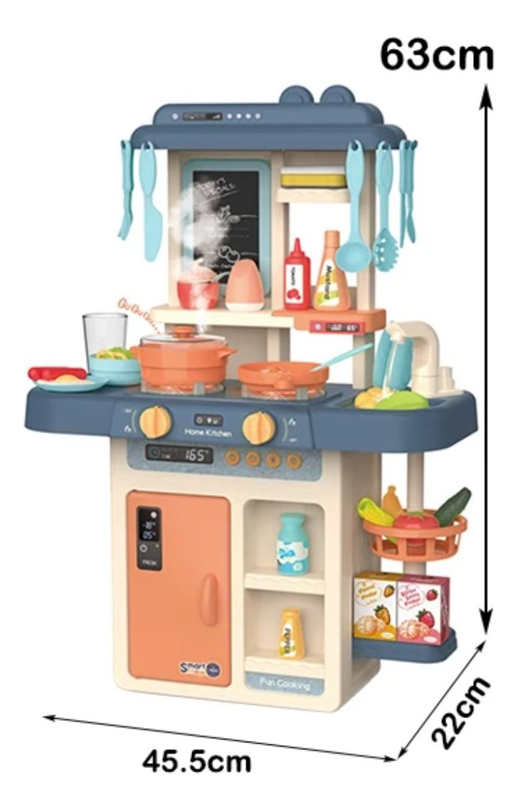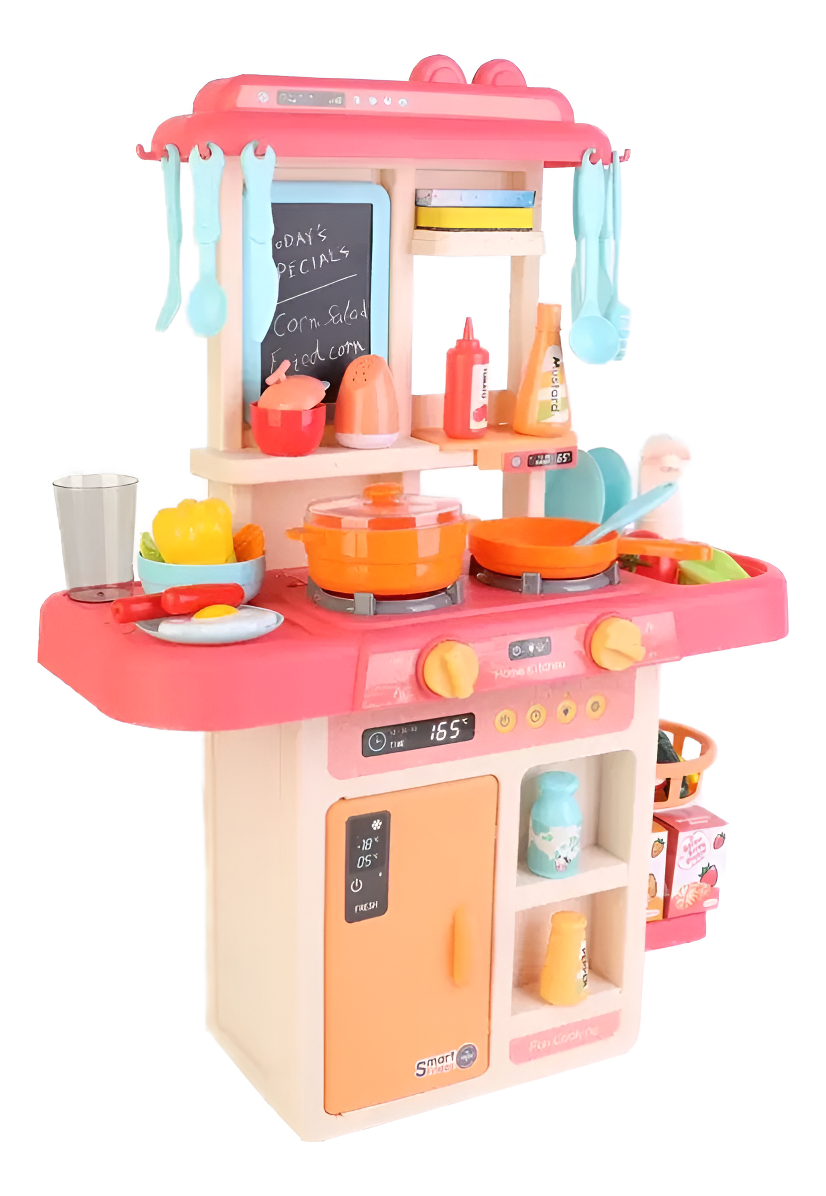 Juego de cocina para niños pequeños con luz, sonido y spray, ideal para una experiencia divertida y realista. Fabricado en plástico resistente, incluye 41 piezas y accesorios como tomate, huevo frito, choclo, cuchara, tenedor, olla, sartén, espátula, cucharón, cuchillo, salero, pimentero, vaso, entre otros. Viene con pilas AA y pegotines decorativos. Además, cuenta con un menú para que los más pequeños puedan elegir qué cocinar, estimulando así la imaginación, el juego creativo y la diversión.