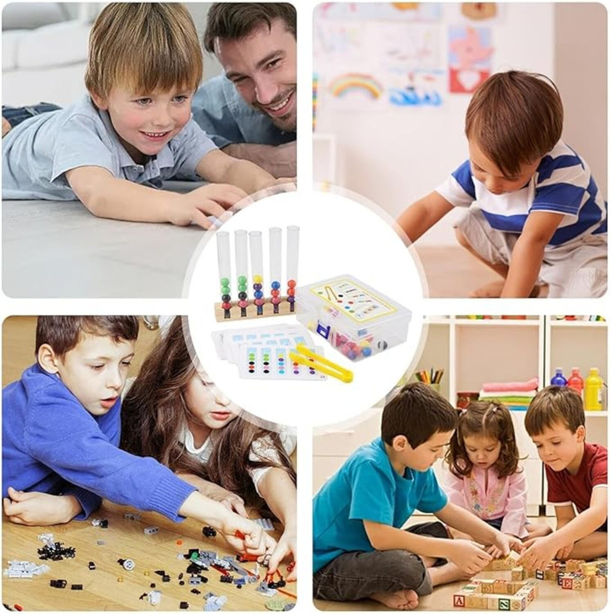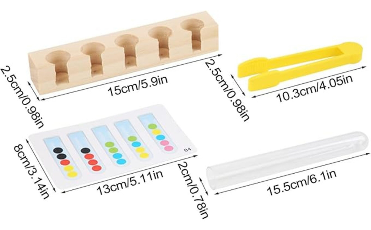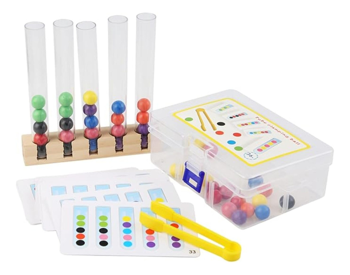 Este juego educativo está diseñado para desarrollar habilidades motoras finas y coordinación en los niños. Con tubos de ensayo de diferentes tamaños, los pequeños deben clasificar y colocar objetos de colores o formas variadas, estimulando la concentración, destreza manual y el pensamiento lógico. Ideal para el aprendizaje Montessori, promueve el reconocimiento de colores y formas mientras refuerza habilidades cognitivas esenciales.