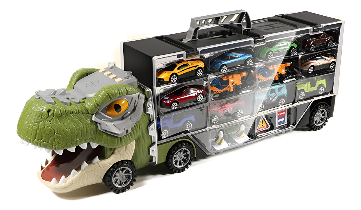 **Dino Camión Rampa:** Diseñado con detalles cautivadores, este camión rampa incorpora elementos de la era jurásica, despertando la imaginación de los niños y llevando sus juegos a un nivel superior.