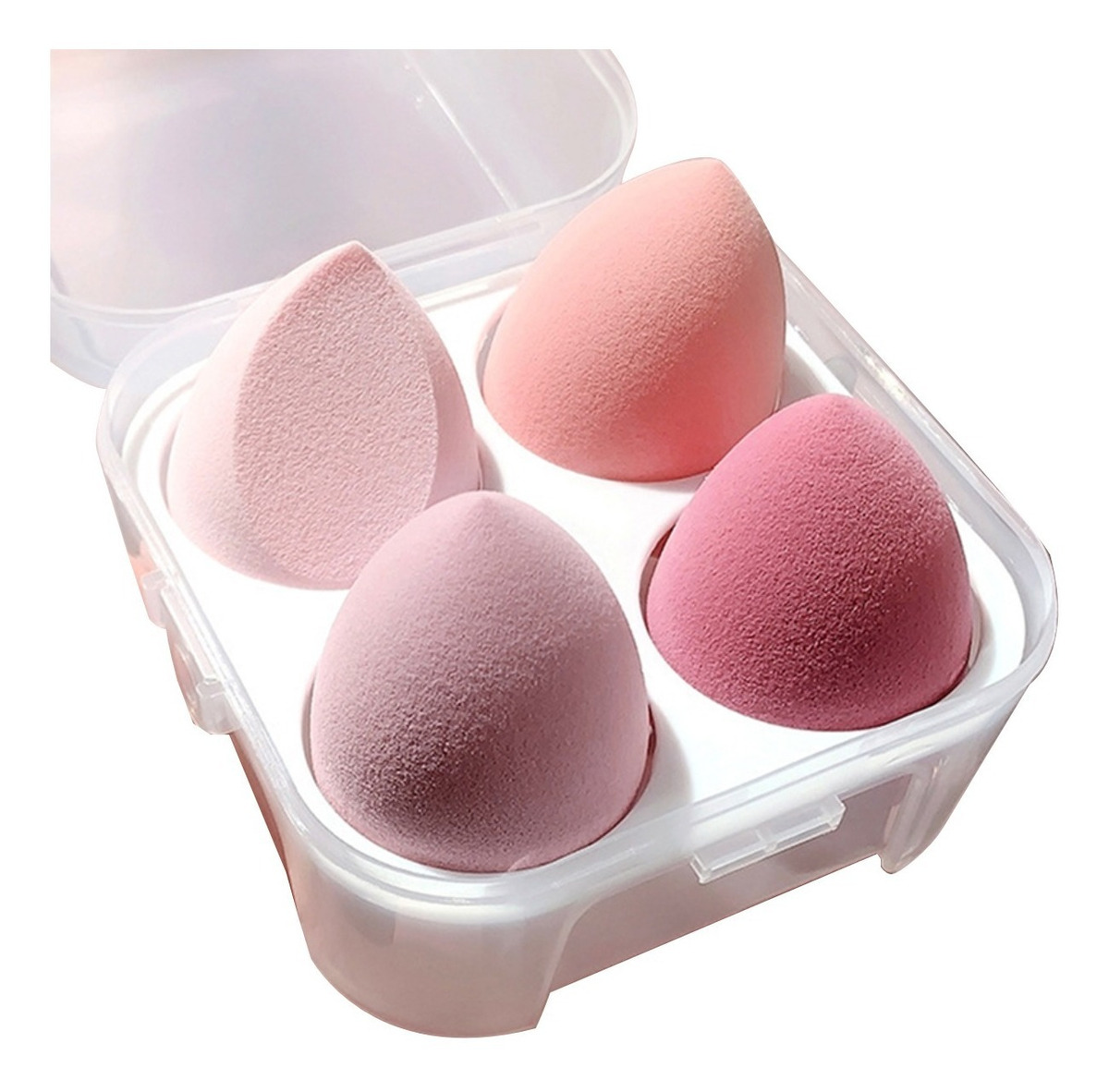 Práctico kit de 4 esponjas con forma de gota para maquillaje super flexibles, no deforman y expanden al absorber agua facilitando el maquillaje. Incluye organizador portable para tenerlas siempre limpias y a la mano Fabricadas en esponja hidrofílica sin látex