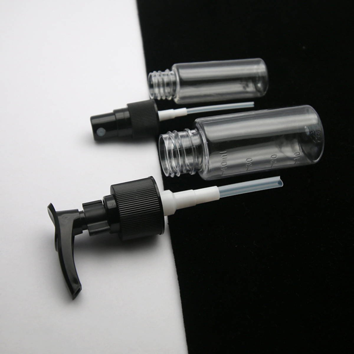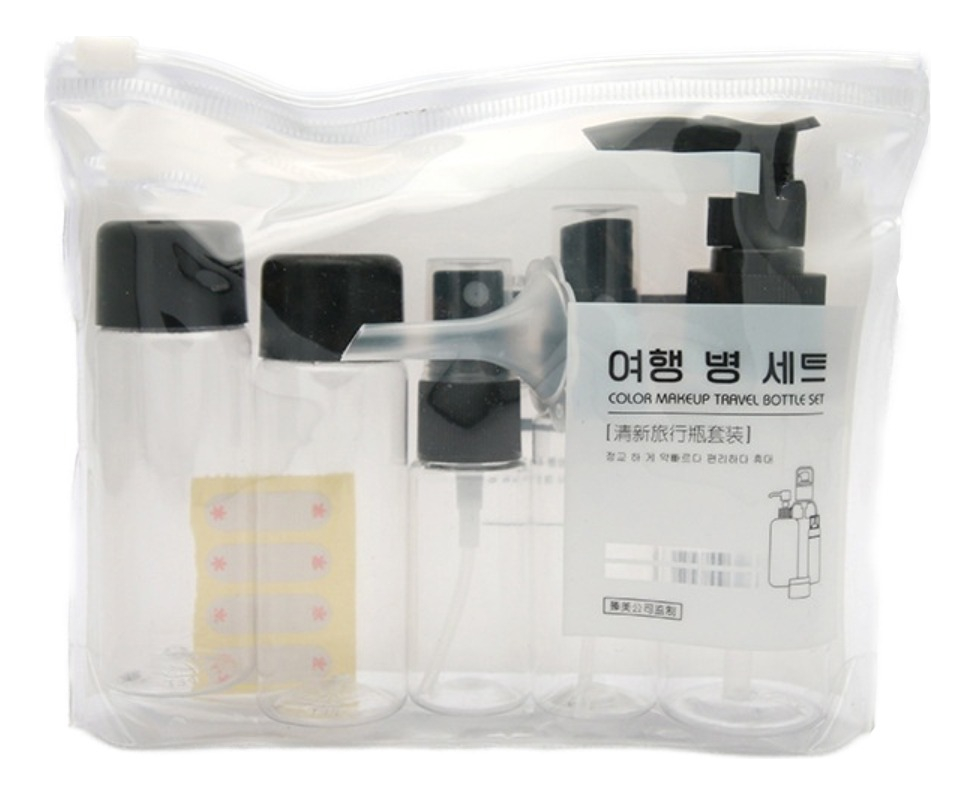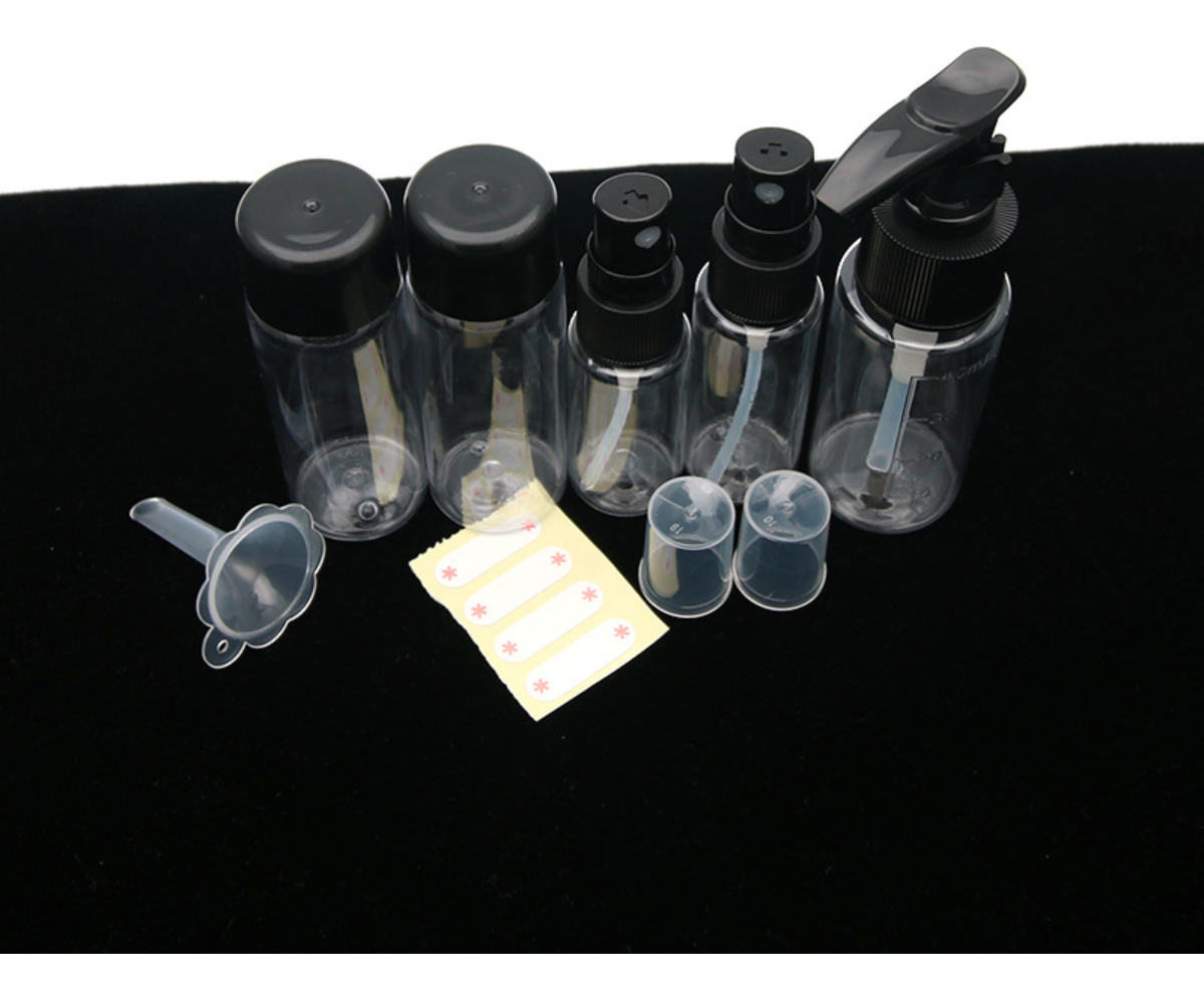NEGRO: – 2 Botellas con tapa rosca. – 2 Botellas con spray para líquidos – 1 Botella con tapa pump para bálsamos y cremas – 1 Mini embudo