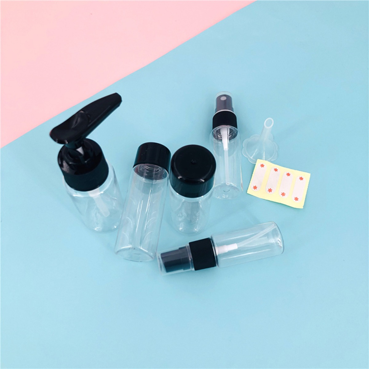 ROSA o CELESTE: – 1 Botella con tapa común. – 2 Botellas con spray para líquidos – 1 Botella con tapa pump para bálsamos y cremas – 2 Potes para cremas o báslamos con tapa rosca – 1 Mini embudo
