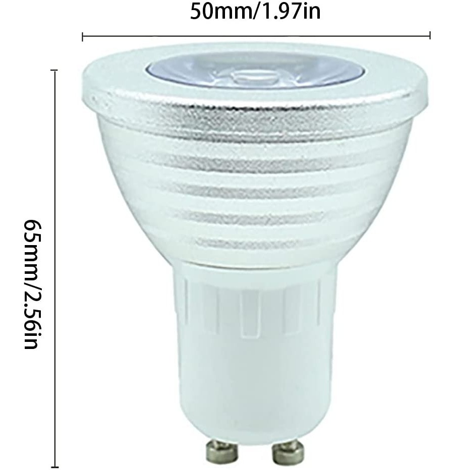 PASE GU10 Voltaje estándar. Material de Aluminio y Plástico. Total de energía: 5W Tecnología LED (no consume casi nada – incluso mucho mucho menos que las lamparas de bajo consumo convencionales). Vida útil: Entre 40.000 y 50.000 horas.