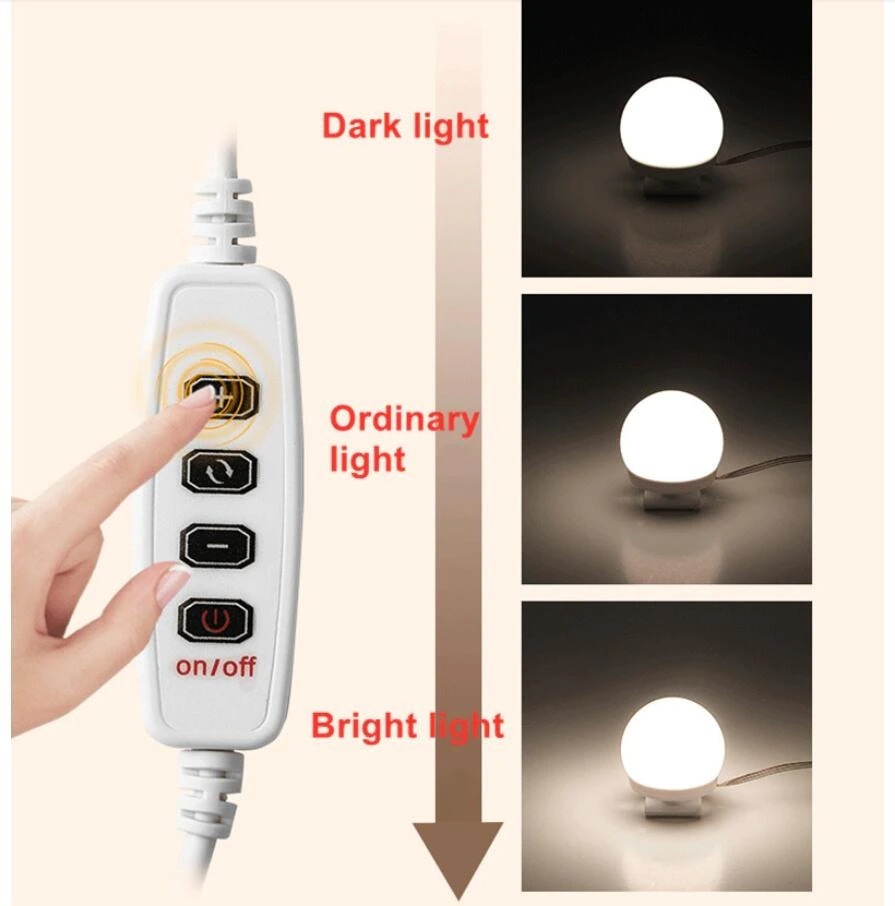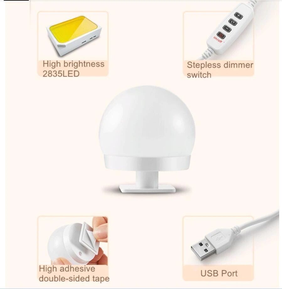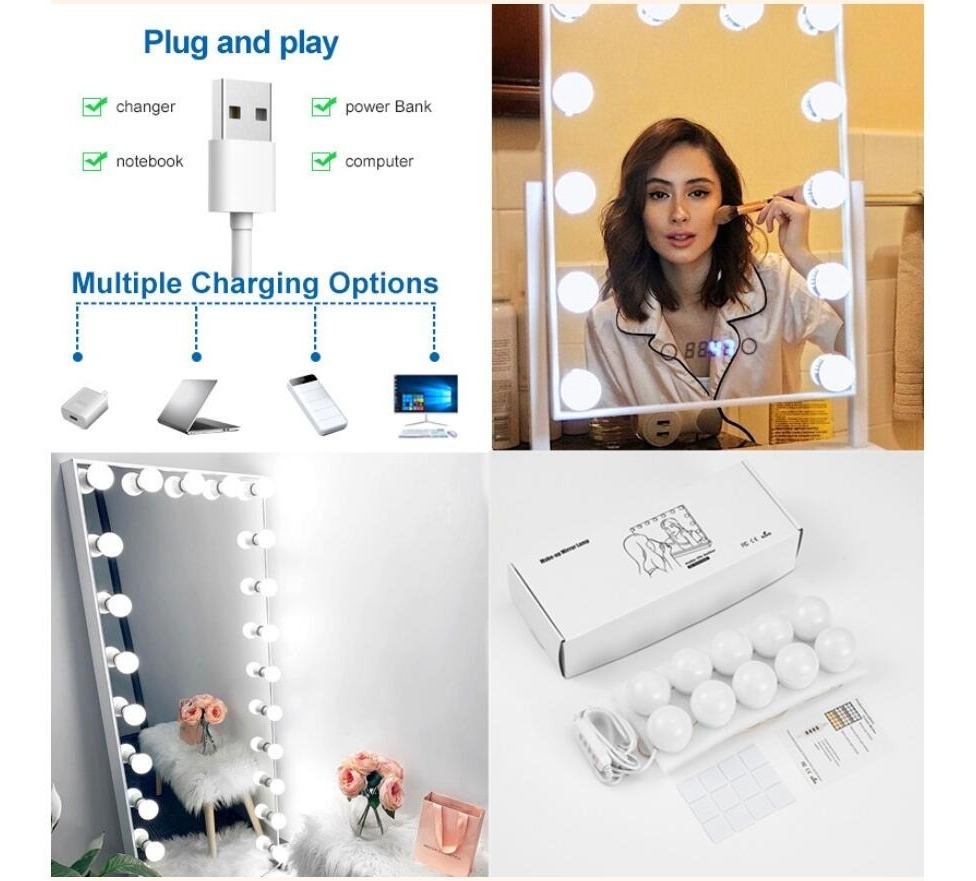 Productos de ventajas: * Bombillas de tocador estilo Hollywood luz led para espejo, el nuevo diseño, versión avanzada, más hermosa y más conveniente. * El puerto USB, las bombillas y la fuente de alimentación se pueden conectar por USB de muchas maneras, como computadora portátil, Banco de energía, enchufe, por lo que es muy conveniente al usarlo. * Ajuste de brillo, el brillo se puede ajustar de brillante a oscuro, de oscuro a brillante, según sus necesidades. * Está equipado con función de memoria, graba el último modo de iluminación cuando lo usa y es el mismo modo de iluminación cuando lo usa de nuevo. * La distancia máxima entre dos bombillas es de aproximadamente 33cm, lo que hace que se ajuste a la mayoría de los espejos. * Ajuste de longitud del cable, la distancia más pequeña entre dos bombillas se puede reducir a aproximadamente 1,7 cm, si crees que está demasiado cerrado, se puede alargar, según tus necesidades. Muy fácil de operar. * Lo más importante es que el exceso de cables están ocultos en las bombillas, que no se pueden ver fuera, para mantener tu espejo limpio, hermoso y elegante. * Se proporcionan cintas de doble cara y ventosas, las bombillas se pueden pegar directa y rápidamente en los espejos con cintas o ventosas. * Voltaje de entrada DC 12V, seguro de usar. * Buen efecto de enfriamiento, ahorro de energía, larga vida útil. * Luz suave, alta eficiencia luminosa, sin radiación de calor, sin parpadeo, sin manchas, protección ocular, proporcionando una iluminación profesional para el maquillaje. * Se puede utilizar para maquillaje, luz de relleno, decoración, lámpara de decoración de espejo, lámpara de decoración de escenario, lámpara de decoración de gabinete, lámpara de decoración de estudio, etc. * Es adecuado para bodas, fiestas de cumpleaños, San Valentín y otras fiestas.