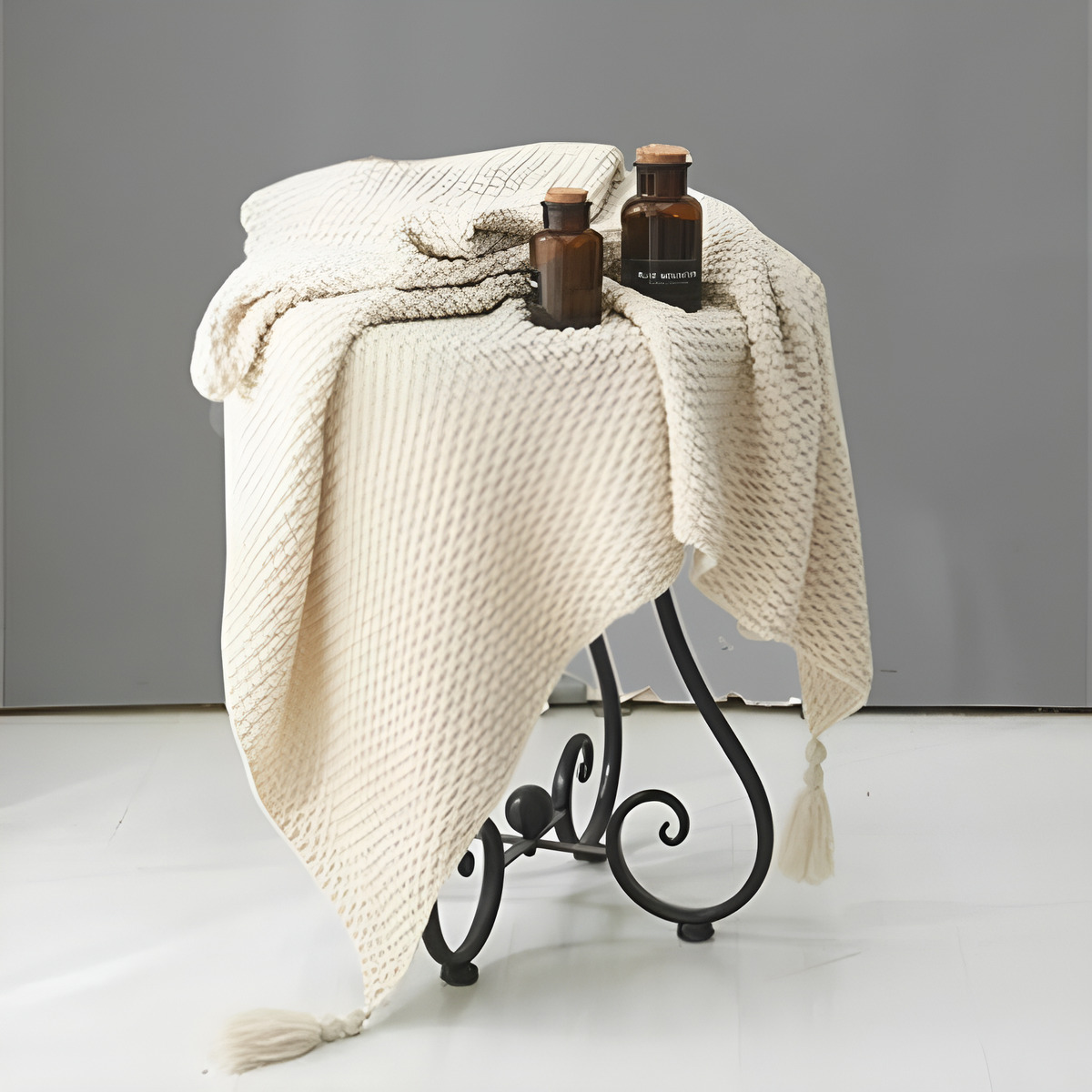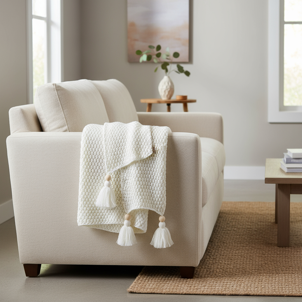 Disfrutá de la calidez y suavidad con esta manta de lana tejida, ideal para acurrucarte en el sofá durante los días fríos. Su textura acogedora y diseño elegante con borlas decorativas la convierten en el complemento perfecto para tu living o dormitorio. Mide 70×100 cm, lo que la hace práctica y versátil tanto para adultos como para niños. Además de funcional, aporta un toque decorativo y moderno a cualquier espacio.