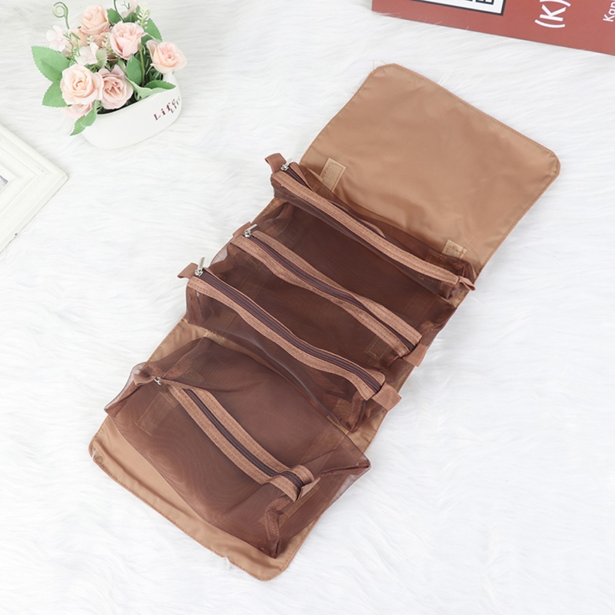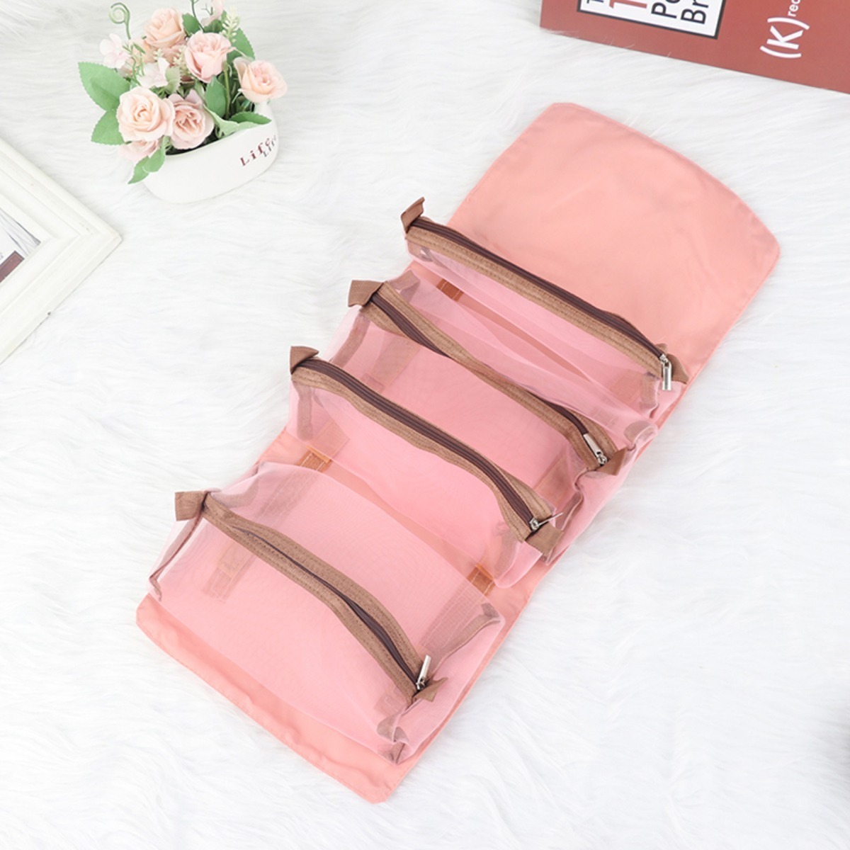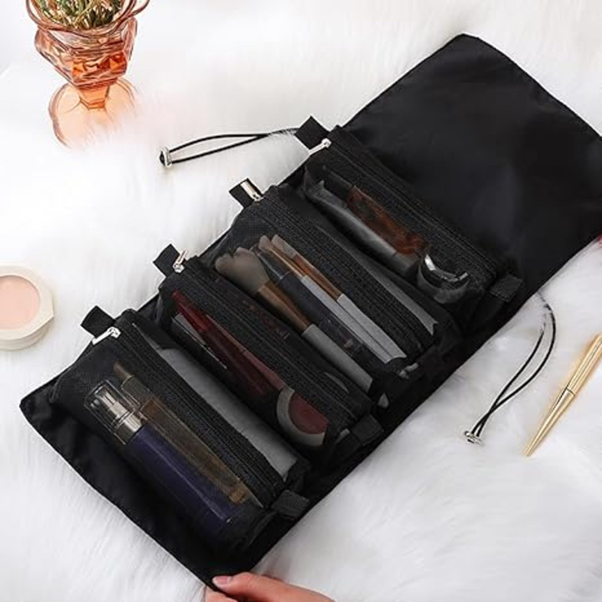 Práctico neceser plegable, cuenta con 4 compartimentos de distintas capacidades, estilo cartuchera que se adhieren por velcro, lo que permite extraerlos, reordenarlos, cambiarlos y mucho más. Gran capacidad y versatilidad. Tamaño abierto: 24cm x 55cm Tamaño cerrado: 15cm x 24cm Tamaño cartucheras grandes: 22cm x 13cm Tamaño cartucheras chicas: 22cm x 5cm