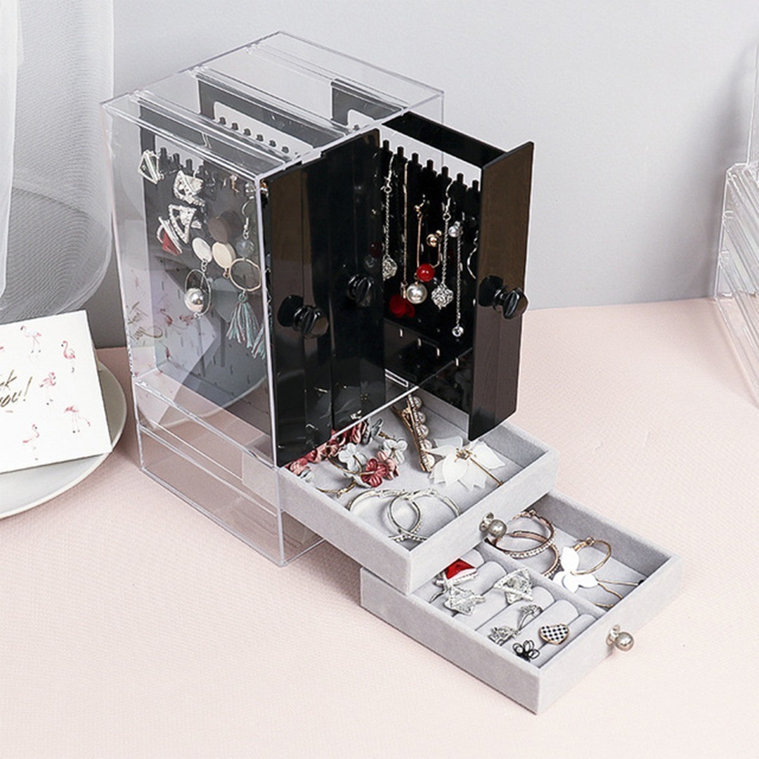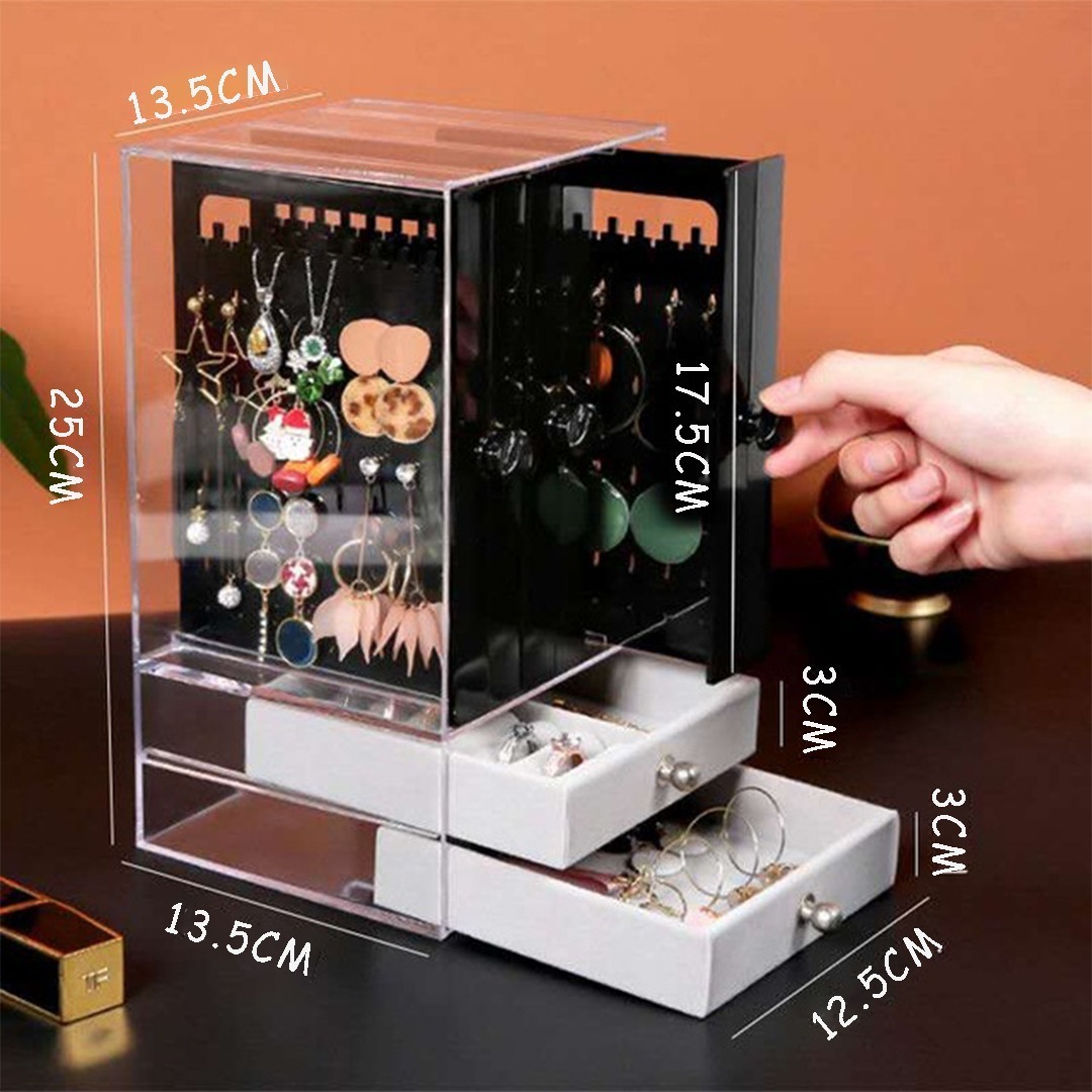 Organizador exhibidor de joyas con diseño elegante, ideal para mantener tus accesorios organizados y a la vista. Hecho de material plástico PS de alta calidad, 100% nuevo y resistente. Cuenta con un cajón para almacenamiento adicional y es a prueba de polvo, lo que asegura la protección de tus joyas y objetos delicados. Su estilo japonés lo convierte en una pieza moderna y funcional, perfecta para cualquier espacio de almacenamiento. Ideal para joyas, relojes, anillos, y más
