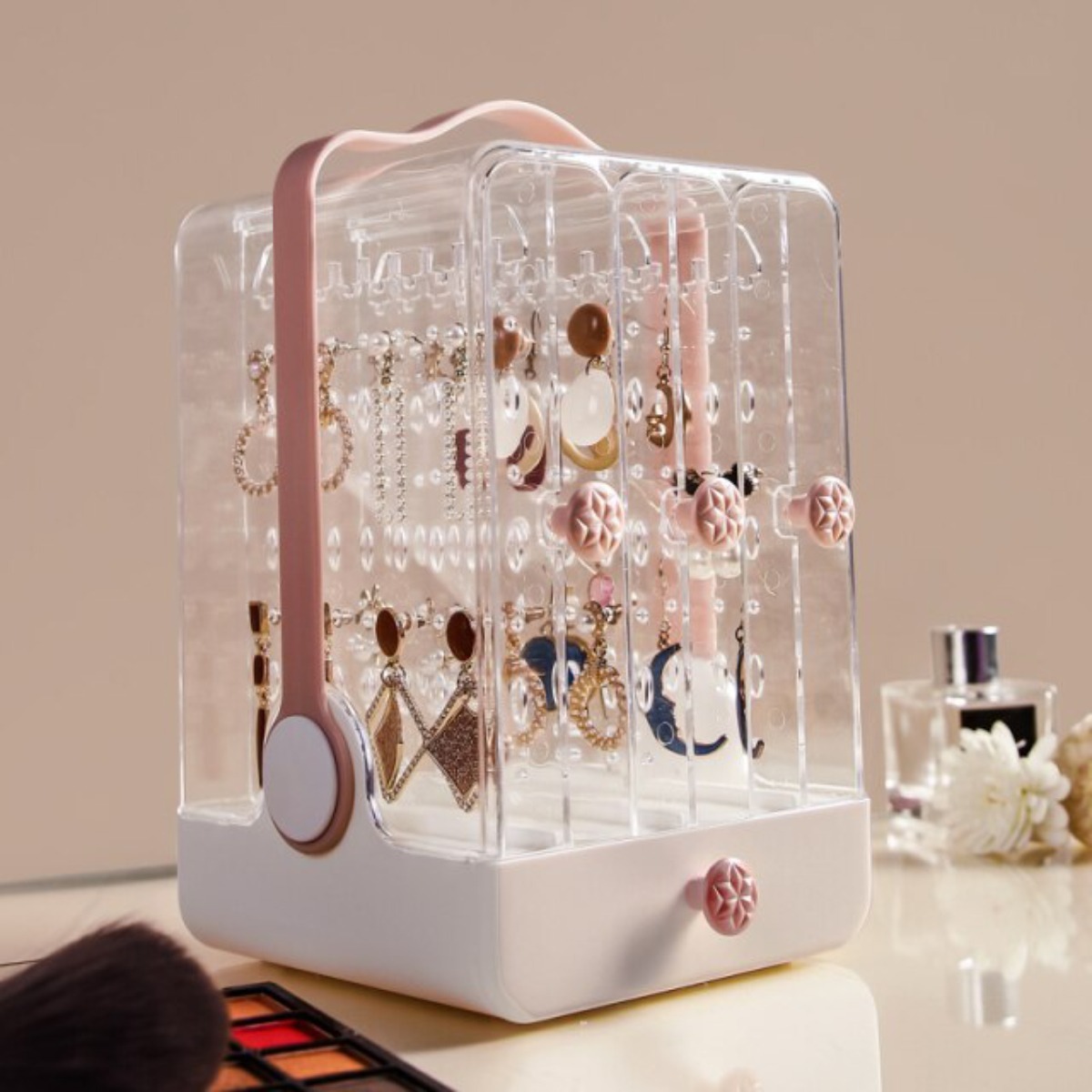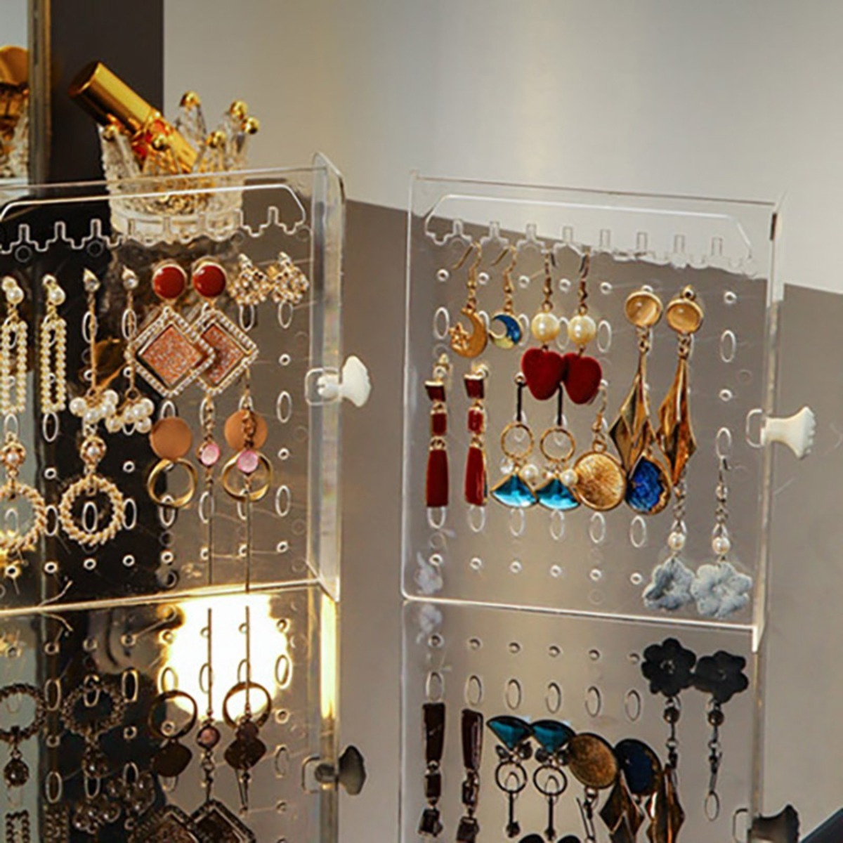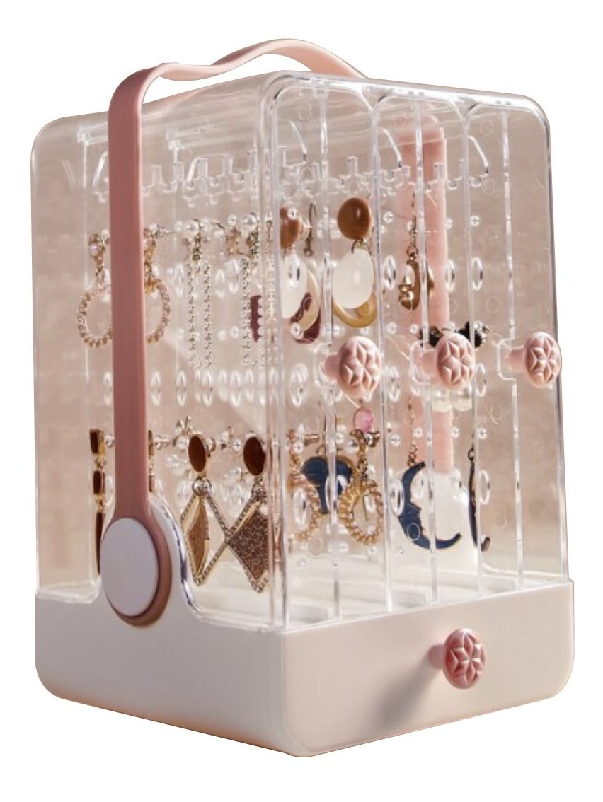 Delicado, práctico y decorativo, este organizador/exhibidor es perfecto para guardar toda tu joyería, puedes colgar caravanas, pulseras y collares en las secciones verticales, y guardar cosméticos, brazaletes o artículos más largos en su cajón.