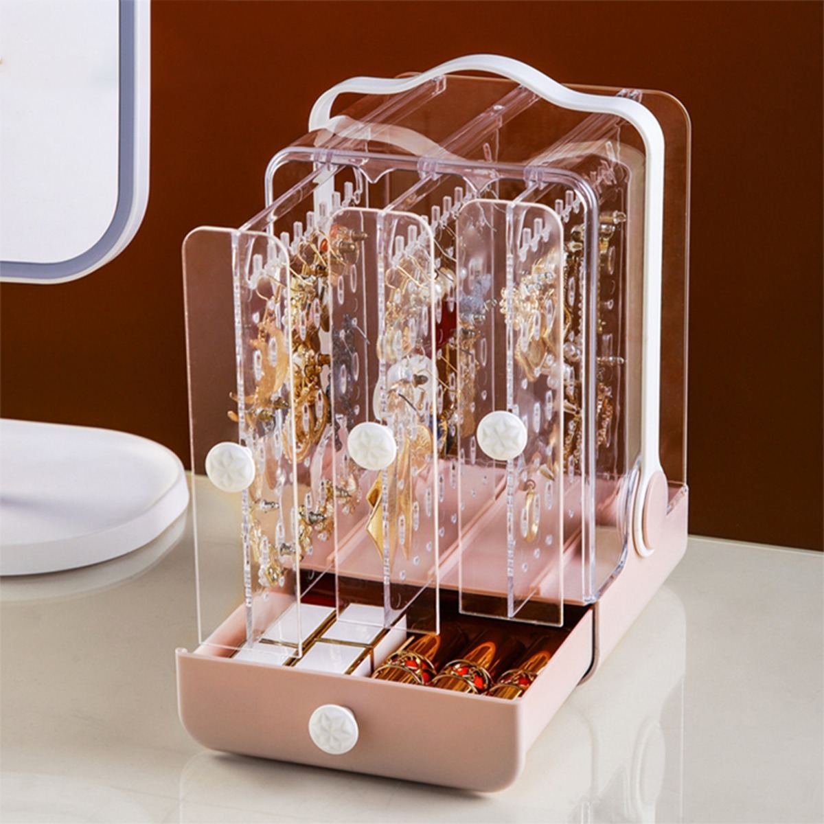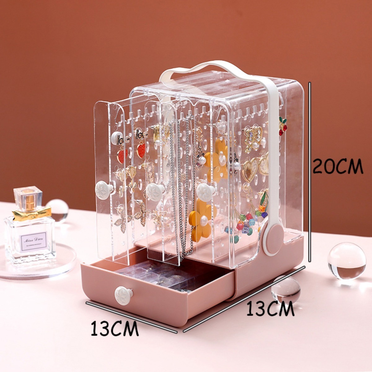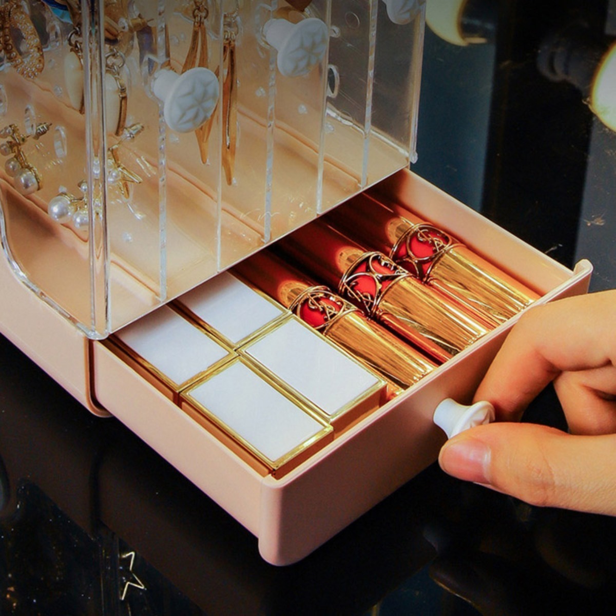 Delicado, práctico y decorativo, este organizador/exhibidor es perfecto para guardar toda tu joyería, puedes colgar caravanas, pulseras y collares en las secciones verticales, y guardar cosméticos, brazaletes o artículos más largos en su cajón.