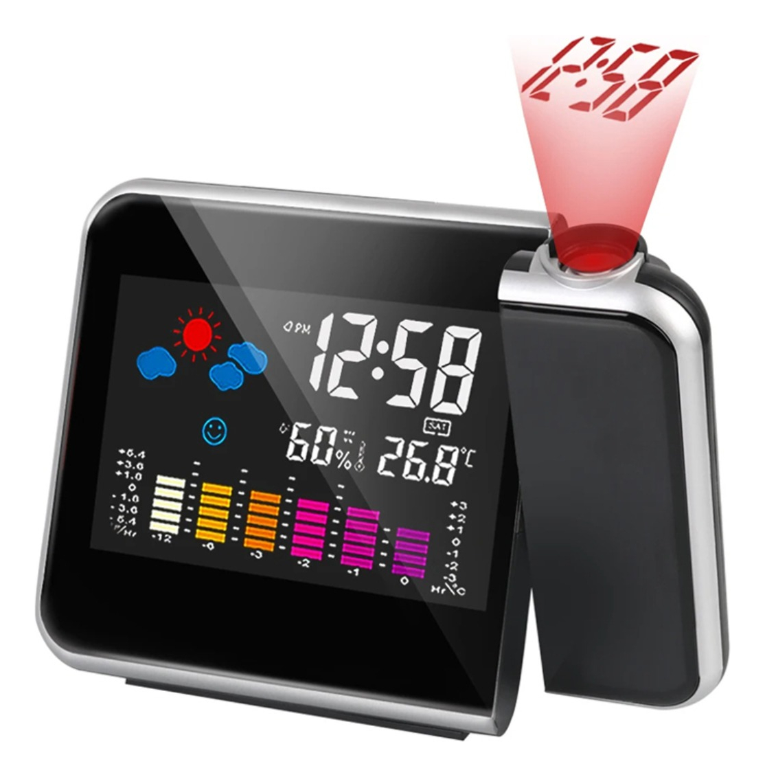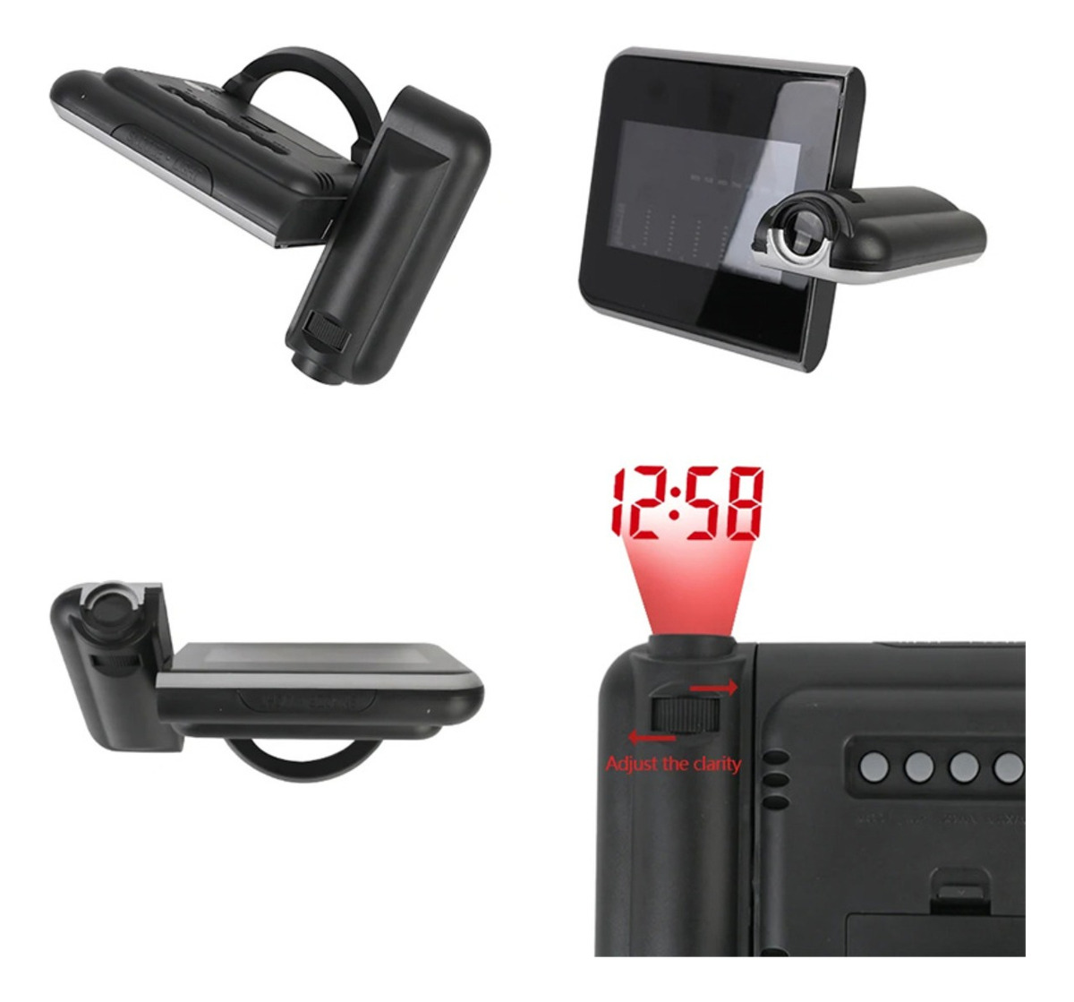 Reloj despertador de mesa con un innovador laser proyector con capacidad de rotación de 180 grados. El reloj cuenta con: Horario, Calendario, Medidor de temperatura, humedad y clima.