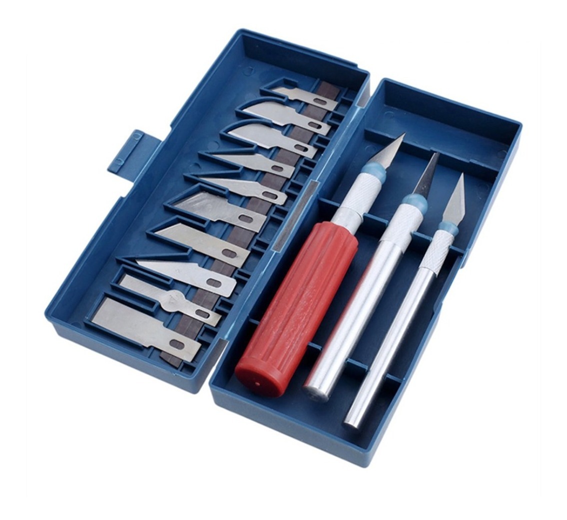 Juego de cutters, trinchetas, bisturí con tres mangos y 13 hojas (3 + 10 de repuesto) muy filosos, perfecto para la fabricación de modelos a escala, grabados, tallado, desgomados etc.
