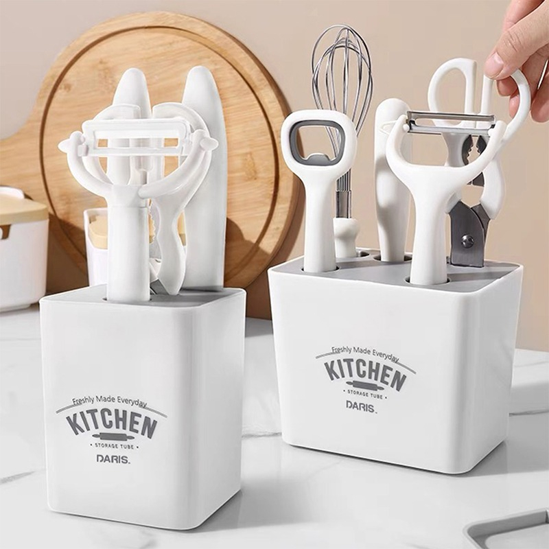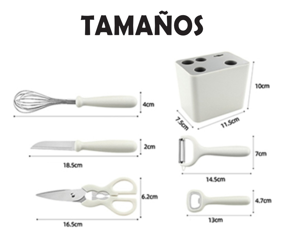 Piezas: Pelador, destapador, batidor, tijera y cuchillo + base.