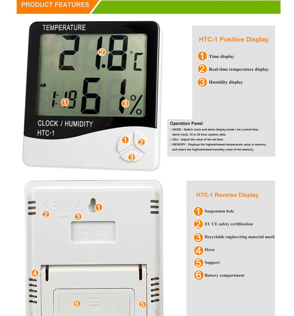 – Pantalla con temperatura, humedad y reloj de forma simultánea. – Alta estabilidad y precisión – Memoria de Maxima y Mínima. – Sistema de visualización de horas seleccionable (12/24). – Opción de grados Centigrados o Fahrenheit ( ºC / ºF ) seleccionable. – Función reloj y calendario (mes y día). – Función de alarma. – Colocación de Sobremesa o para colgar en la pared. – Rango de temperatura: -50 + 70 º C (-58 158 º F). – Rango de humedad: 10% 99% RH. – Temperatura base: 0,1 º C (0,1 º F). – Precisión: +/- 1 º C (1,8 º F). – Humedad: +/- 5% de humedad relativa (40% 80%). – Fuente de alimentación: 1 x 1,5 V (tamaño AAA) Bajo consumo de energía. – Dimensión del producto: 100 x 108 x 20 mm. – Peso: approx.160g. – Condiciones de almacenamiento: -20 º C 60 º C, 20 80%. – RH Incluye: 1 x medidor de temperatura, humedad con reloj y alarma