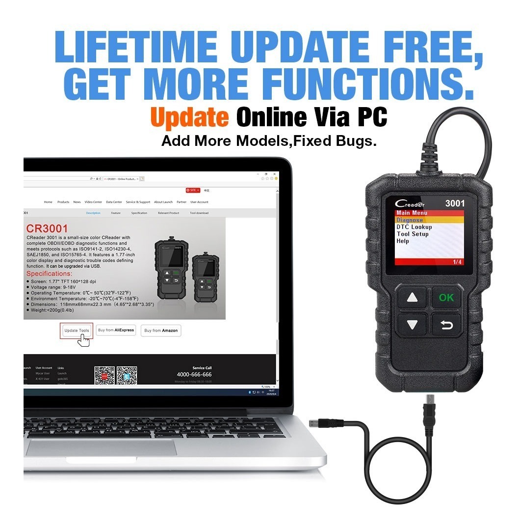 Actualización gratuita LAUNCH CR3001 en línea Si el producto muestra una pantalla blanca o no es compatible con tu coche, puedes resolverlo actualizándolo. Sistema de actualización de soporte:Compatible con Windows XP, Windows 7, Windows 8 y Windows 10